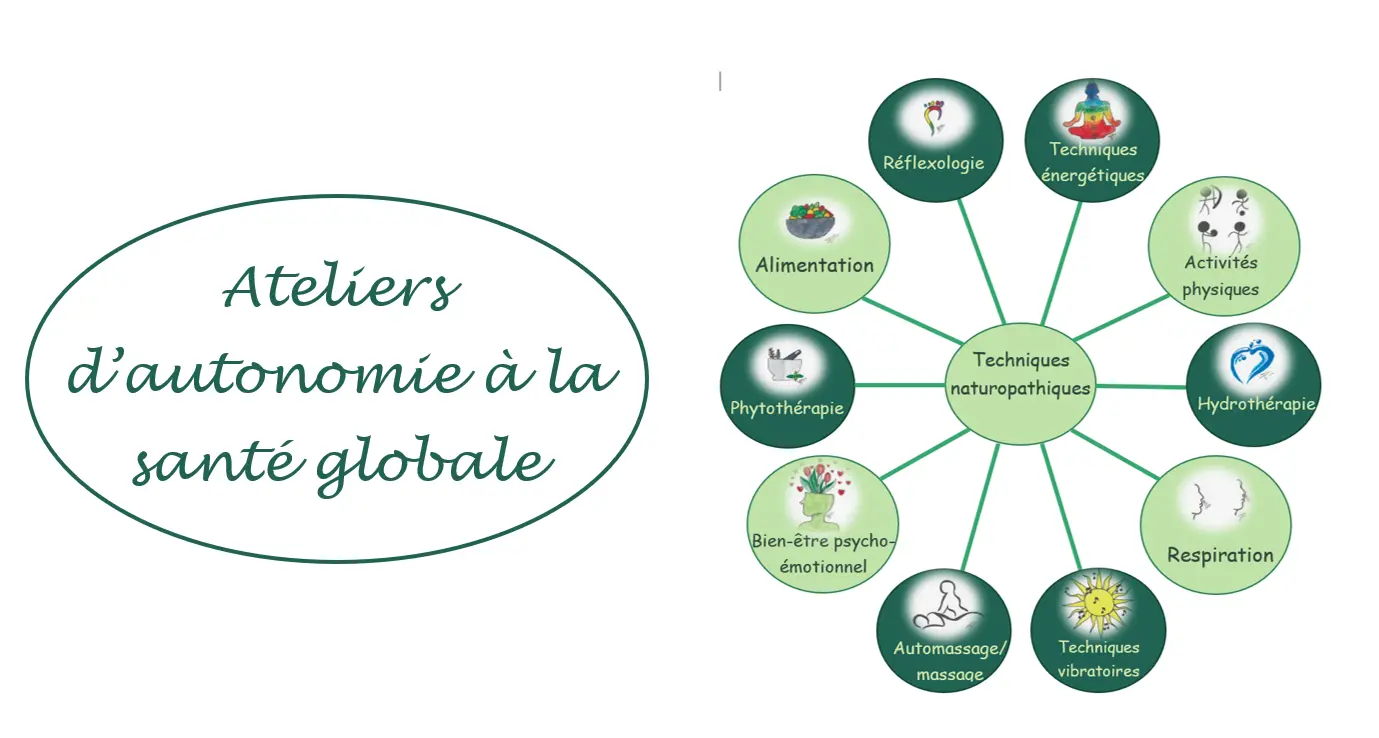 Des ateliers d’Autonomie à la santé globale sont organisés dans différents endroits. Ils permettent de devenir acteur de sa santé en utilisant les différentes techniques naturopathiques. Ce sont des ateliers d’1h30 qui commencent avec des notions théoriques pour que vous ayez les clés du fonctionnement de votre corps. Ensuite, vous testez différentes pratiques et ressentez les bienfaits qu'elles vous apportent.